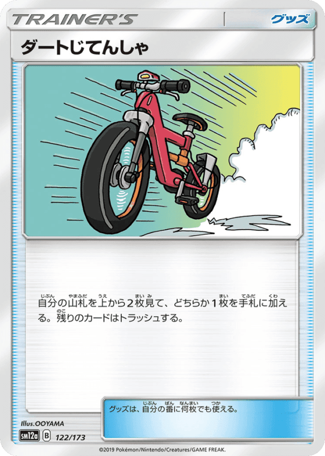 自分の山札を上から2枚見て、どちらか1枚を手札に加える。残りのカードはトラッシュする。 グッズは、自分の番に何枚でも使える。