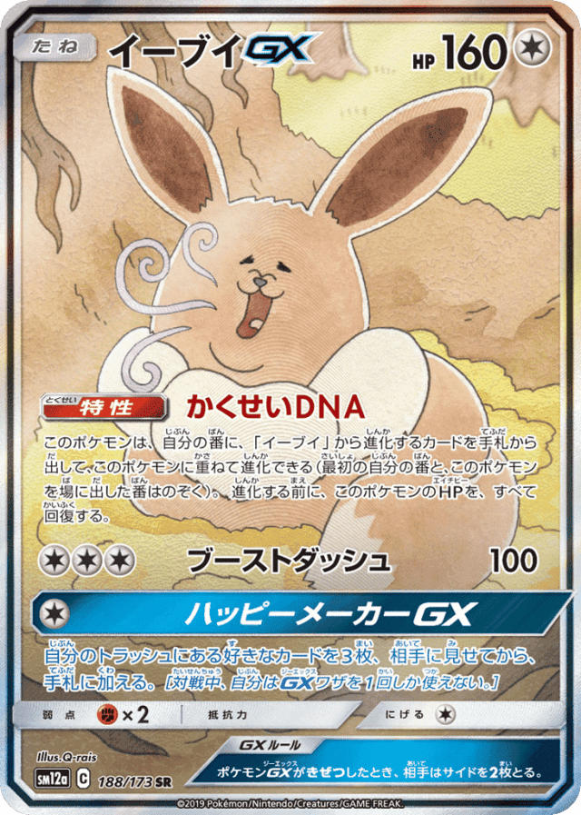 Ascension DNAこのポケモンは、自分の番に、「イーブイ」から進化するカードを手札から出して、このポケモンに重ねて進化できる(最初の自分の番と、このポケモンを場に出した番はのぞく)。進化する前に、このポケモンのHPを、すべて回復する。