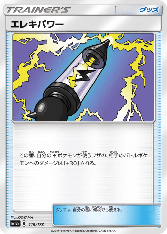 この番、自分のElectricポケモンが使うワザの、相手のバトルポケモンへのダメージは「+30」される。 グッズは、自分の番に何枚でも使える。