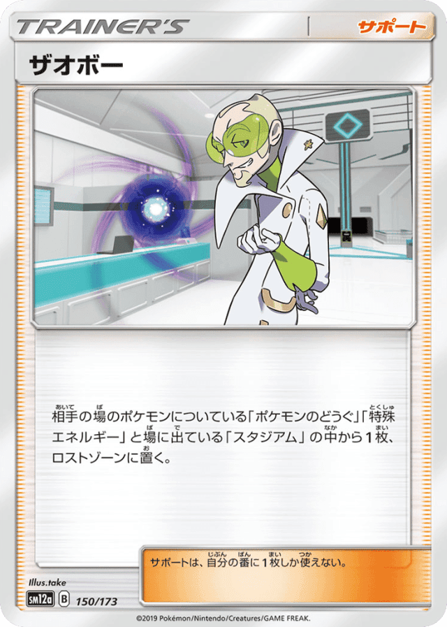 相手の場のポケモンについている「ポケモンのどうぐ」「特殊エネルギー」と場に出ている「スタジアム」の中から1枚、ロストゾーンに置く。 サポートは、自分の番に1枚しか使えない。