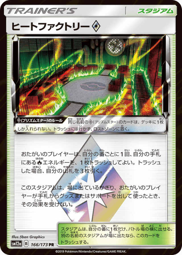 おたがいのプレイヤーは、自分の番ごとに1回、自分の手札にあるFireエネルギーを、1枚トラッシュしてよい。トラッシュした場合、自分の山札を3枚引く。 このスタジアムは、場に出ているかぎり、おたがいのプレイヤーが手札からグッズまたはサポートを出して使ったとき、その効果を受けない。 スタジアムは、自分の番に1枚だけ、バトル場の横に出せる。別の名前のスタジアムが場に出たなら、このカードをトラッシュする。