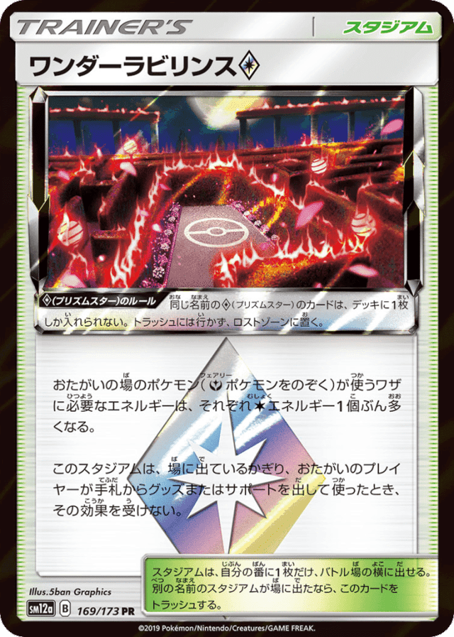 - おたがいの場のポケモン(Fairyエネルギー1個ぶん多くなる。 — このスタジアムは、場に出ているかぎり、おたがいのプレイヤーが手札からグッズまたはサポートを出して使ったとき、その効果を受けない。 — スタジアムは、自分の番に1枚だけ、バトル場の横に出せる。別の名前のスタジアムが場に出たなら、このカードをトラッシュする。