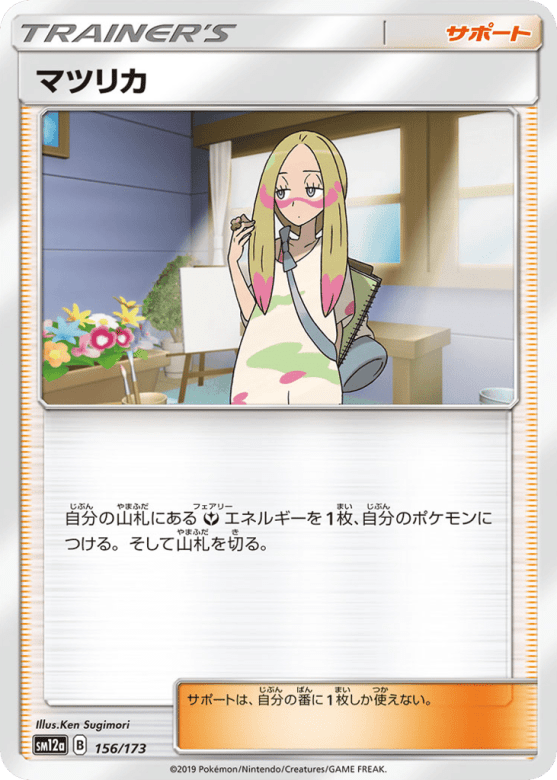 自分の山札にあるFairyエネルギーを1枚、自分のポケモンにつける。そして山札を切る。 サポートは、自分の番に1枚しか使えない。