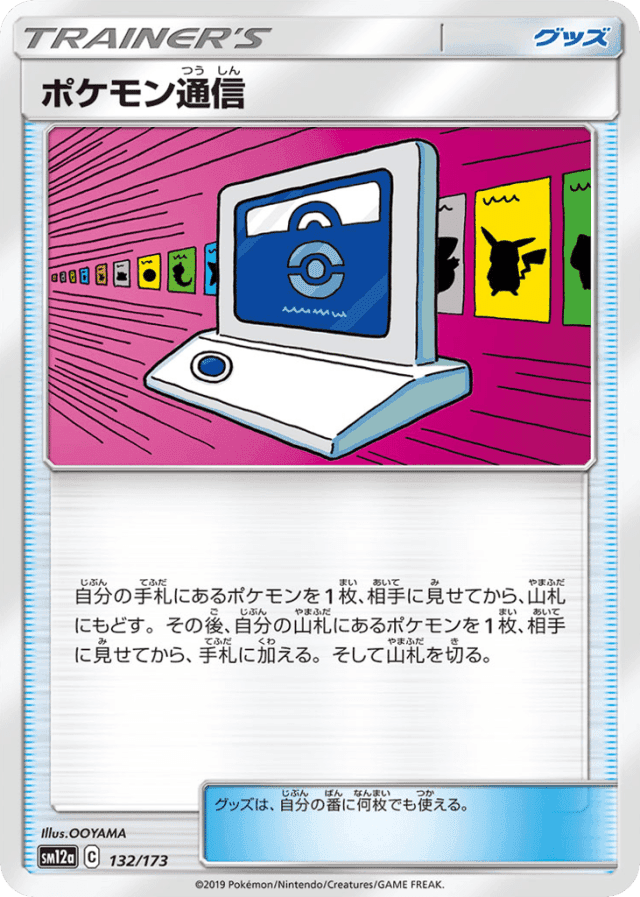 自分の手札にあるポケモンを1枚、相手に見せてから、山札にもどす。その後、自分の山札にあるポケモンを1枚、相手に見せてから、手札に加える。そして山札を切る。 グッズは、自分の番に何枚でも使える。