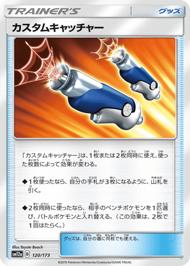 - 「カスタムキャッチャー」は、1枚または2枚同時に使え、使った枚数によって効果が変わる。 — ◆1枚使ったなら、自分の手札が3枚になるように、山札を引く。 — ◆2枚同時に使ったなら、相手のベンチポケモンを1匹選び、バトルポケモンと入れ替える。(この効果は、2枚で1回はたらく。) — グッズは、自分の番に何枚でも使える。
