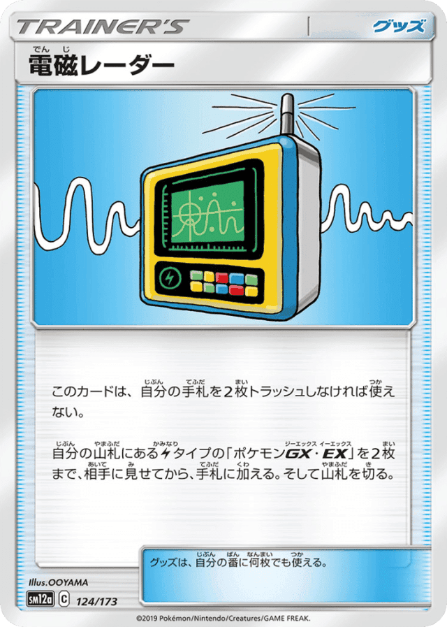 - このカードは、自分の手札を2枚トラッシュしなければ使えない。 — 自分の山札にあるElectricタイプの「ポケモンGX・EX」を2枚まで、相手に見せてから、手札に加える。そして山札を切る。 — グッズは、自分の番に何枚でも使える。
