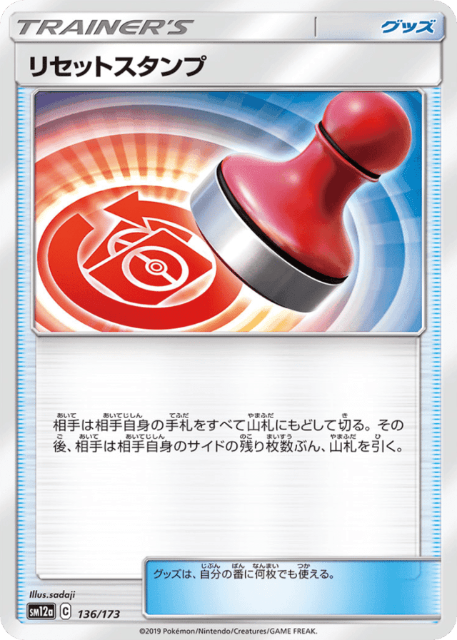 相手は相手自身の手札をすべて山札にもどして切る。その後、相手は相手自身のサイドの残り枚数ぶん、山札を引く。 グッズは、自分の番に何枚でも使える。