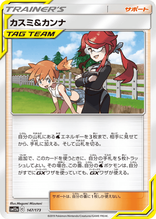 - 自分の山札にあるWaterエネルギーを3枚まで、相手に見せてから、手札に加える。そして山札を切る。 — 追加で、このカードを使うときに、自分の手札を5枚トラッシュしてよい。その場合、この番、自分のWaterポケモンは、自分がすでにGXワザを使っていても、GXワザが使える。 — サポートは、自分の番に1枚しか使えない。