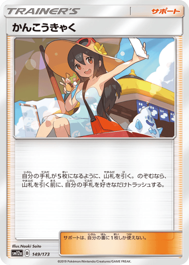 自分の手札が5枚になるように、山札を引く。のぞむなら、山札を引く前に、自分の手札を好きなだけトラッシュする。 サポートは、自分の番に1枚しか使えない。