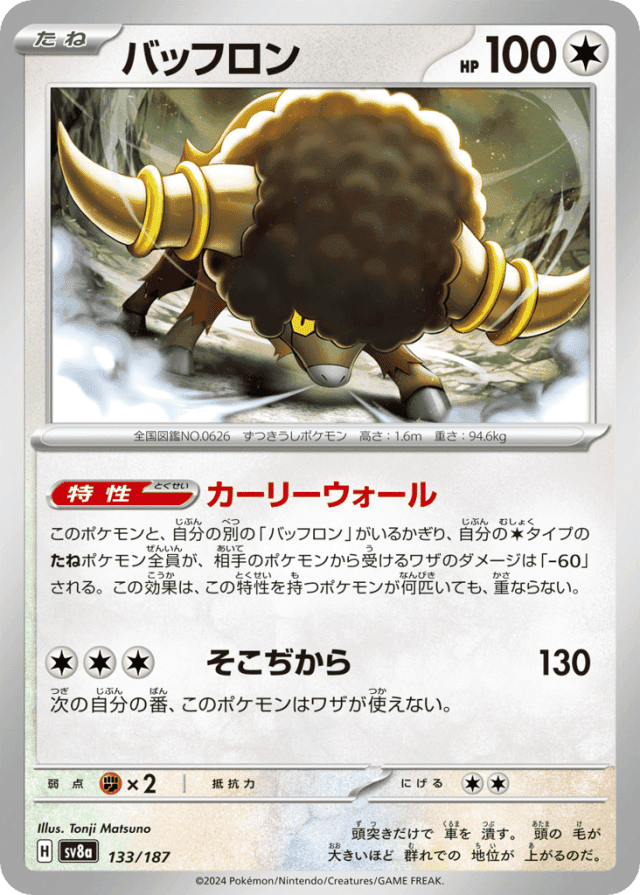 このポケモンと、自分の別の「バッフロン」がいるかぎり、自分のColorlessタイプのたねポケモン全員が、相手のポケモンから受けるワザのダメージは「-60」される。この効果は、この特性を持つポケモンが何匹いても、重ならない。