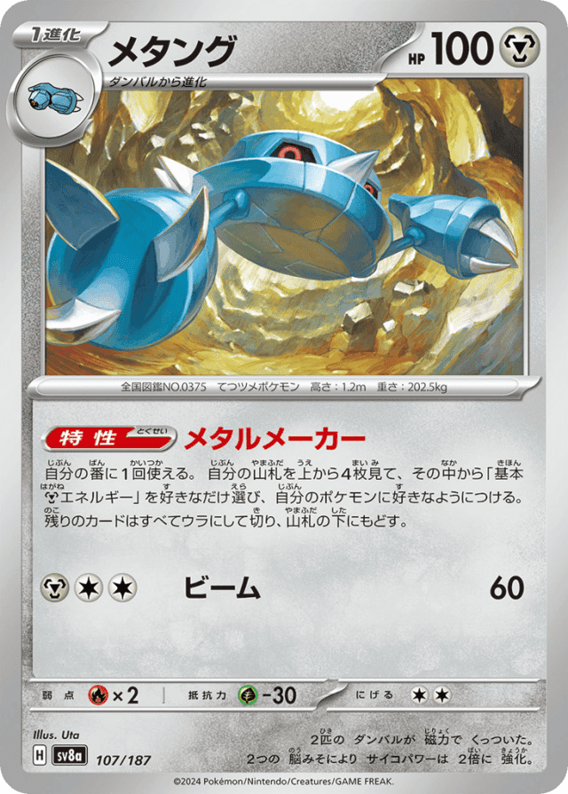 自分の番に1回使える。自分の山札を上から4枚見て、その中から「基本Metalエネルギー」を好きなだけ選び、自分のポケモンに好きなようにつける。残りのカードはすべてウラにして切り、山札の下にもどす。