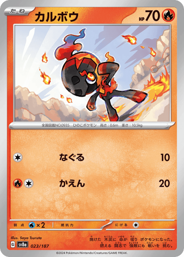 焼けた 木炭に 命が 宿り ポケモンになった。 燃える 闘志で 強敵にも 戦いを 挑む。