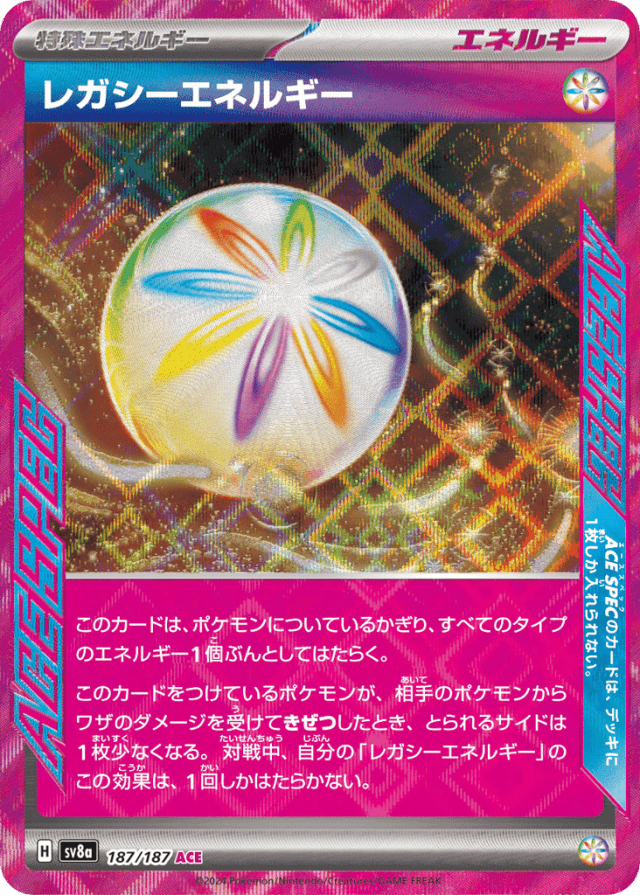 このカードは、ポケモンについているかぎり、すべてのタイプのエネルギー1個ぶんとしてはたらく。<br> <br> このカードをつけているポケモンが、相手のポケモンからワザのダメージを受けてきぜつしたとき、とられるサイドは1枚少なくなる。対戦中、自分の「レガシーエネルギー」のこの効果は、1回しかはたらかない。