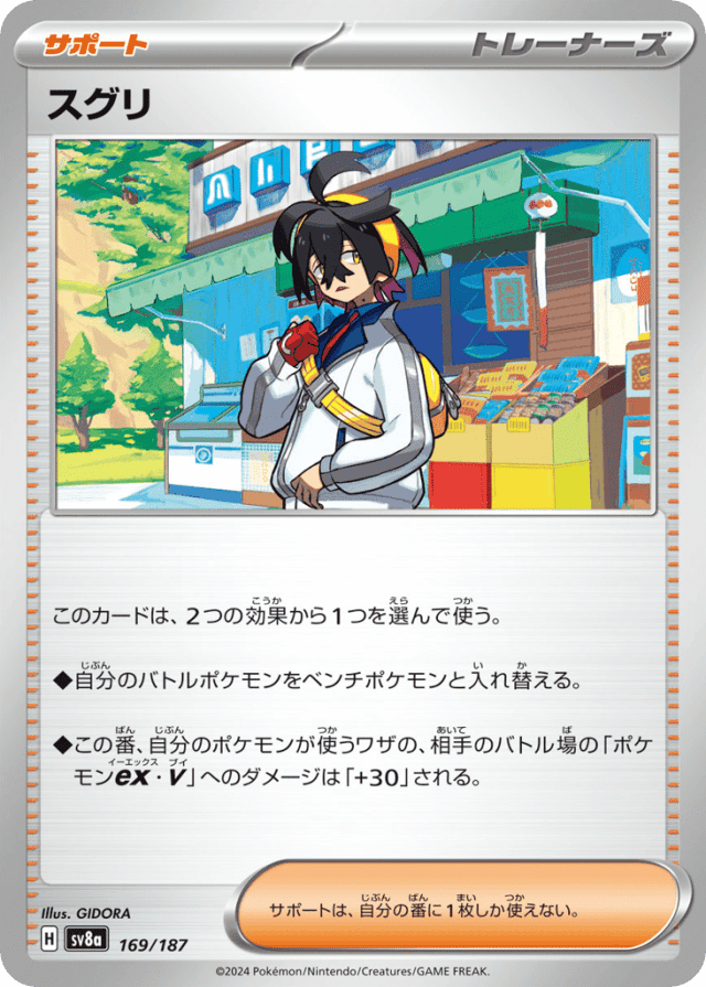 このカードは、2つの効果から1つを選んで使う。 ◆自分のバトルポケモンをベンチポケモンと入れ替える。 ◆この番、自分のポケモンが使うワザの、相手のバトル場の「ポケモンex・V」へのダメージは「+30」される。 サポートは、自分の番に1枚しか使えない。
