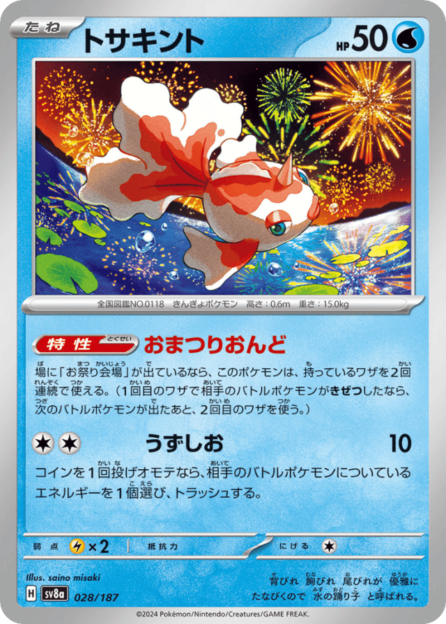 場に「お祭り会場」が出ているなら、このポケモンは、持っているワザを2回連続で使える。(1回目のワザで相手のバトルポケモンがきぜつしたなら、次のバトルポケモンが出たあと、2回目のワザを使う。)