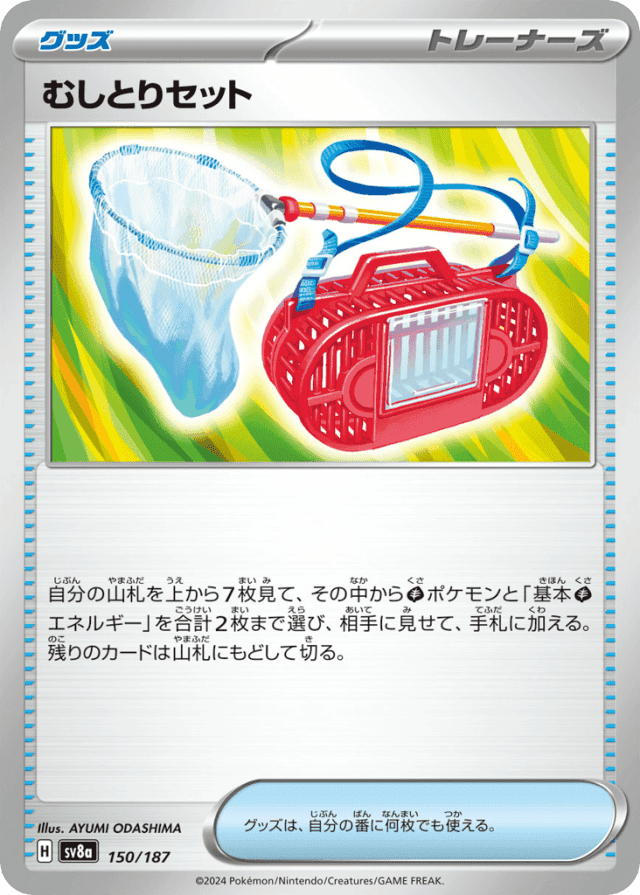自分の山札を上から7枚見て、その中からGrassエネルギー」を合計2枚まで選び、相手に見せて、手札に加える。残りのカードは山札にもどして切る。 グッズは、自分の番に何枚でも使える。