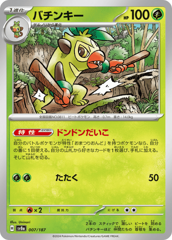 自分のバトルポケモンが特性「おまつりおんど」を持つポケモンなら、自分の番に1回使える。自分の山札から好きなカードを1枚選び、手札に加える。そして山札を切る。
