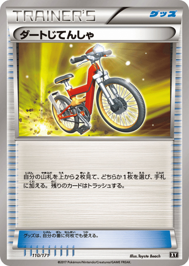 自分の山札を上から2枚見て、どちらか1枚を選び、手札に加える。残りのカードはトラッシュする。 グッズは、自分の番に何枚でも使える。
