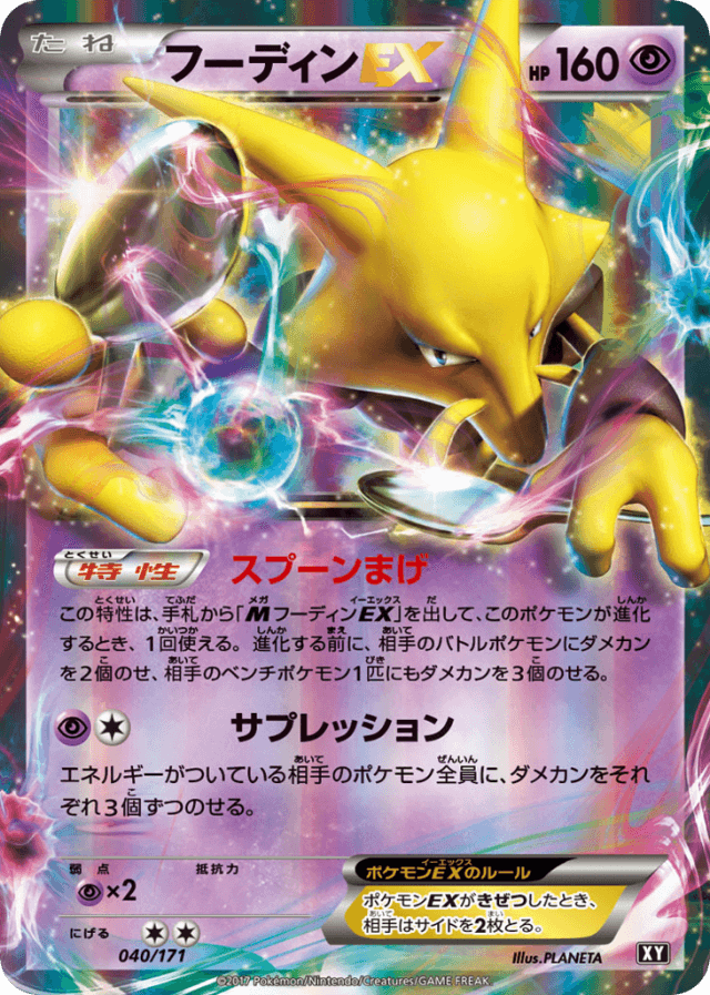 Kinesisこの特性は、手札から「<span class="pcg pcg-megamark"></span>フーディンEX」を出して、このポケモンが進化するとき、1回使える。進化する前に、相手のバトルポケモンにダメカンを2個のせ、相手のベンチポケモン1匹にもダメカンを3個のせる。