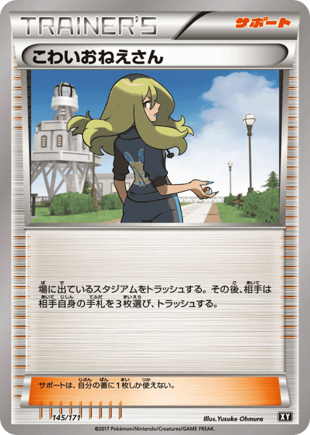 場に出ているスタジアムをトラッシュする。その後、相手は相手自身の手札を3枚選び、トラッシュする。 サポートは、自分の番に1枚しか使えない。
