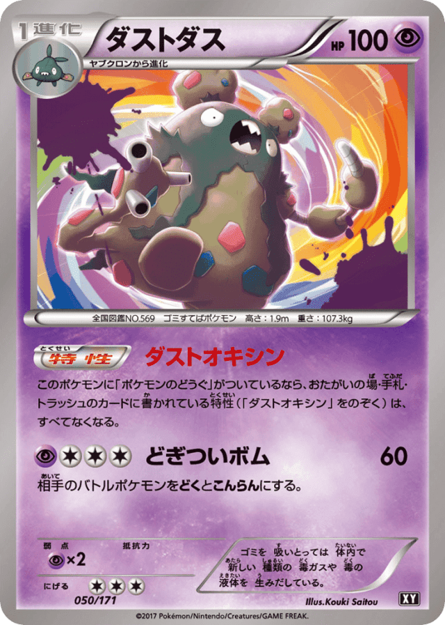 Garbotoxinこのポケモンに「ポケモンのどうぐ」がついているなら、おたがいの場・手札・トラッシュのカードに書かれている特性(「ダストオキシン」をのぞく)は、すべてなくなる。