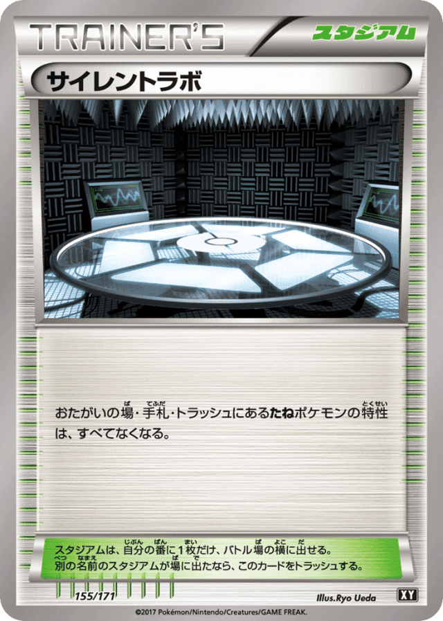 おたがいの場・手札・トラッシュにあるたねポケモンの特性は、すべてなくなる。 スタジアムは、自分の番に1枚だけ、バトル場の横に出せる。別の名前のスタジアムが場に出たなら、このカードをトラッシュする。