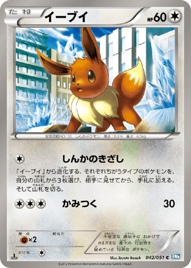 Signs of EvolutionCost: 1「イーブイ」から進化する、それぞれちがうタイプのポケモンを、自分の山札から3枚選び、相手に見せてから、手札に加える。そして山札を切る。