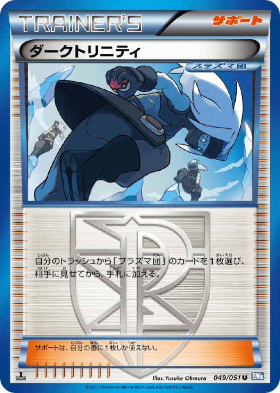 自分のトラッシュから「プラズマ団」のカードを1枚選び、相手に見せてから、手札に加える。 サポートは、自分の番に1枚しか使えない。