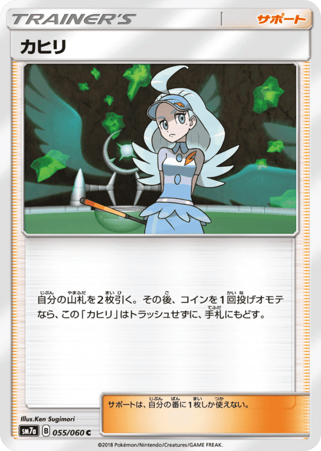 自分の山札を2枚引く。その後、コインを1回投げオモテなら、この「カヒリ」はトラッシュせずに、手札にもどす。 サポートは、自分の番に1枚しか使えない。