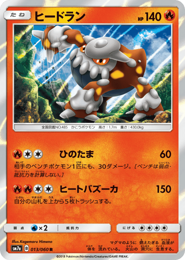 Lava Burn60Cost: 3相手のベンチポケモン1匹にも、30ダメージ。[ベンチは弱点・抵抗力を計算しない。]