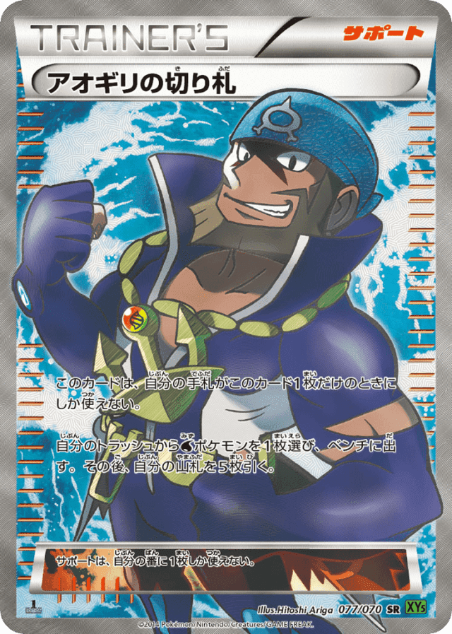 このカードは、自分の手札がこのカード1枚だけのときにしか使えない。 自分のトラッシュからWaterポケモンを1枚選び、ベンチに出す。その後、自分の山札を5枚引く。 サポートは、自分の番に1枚しか使えない。
