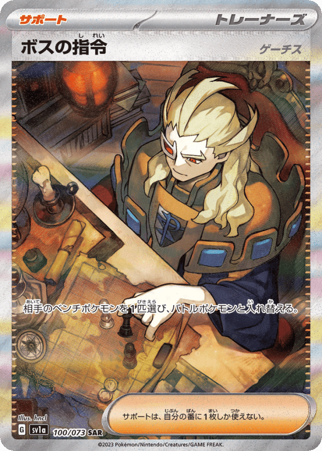 相手のベンチポケモンを1匹選び、バトルポケモンと入れ替える。 サポートは、自分の番に1枚しか使えない。