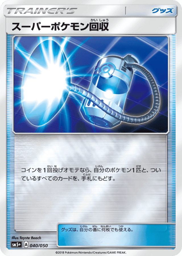 コインを1回投げオモテなら、自分のポケモン1匹と、ついているすべてのカードを、手札にもどす。 グッズは、自分の番に何枚でも使える。