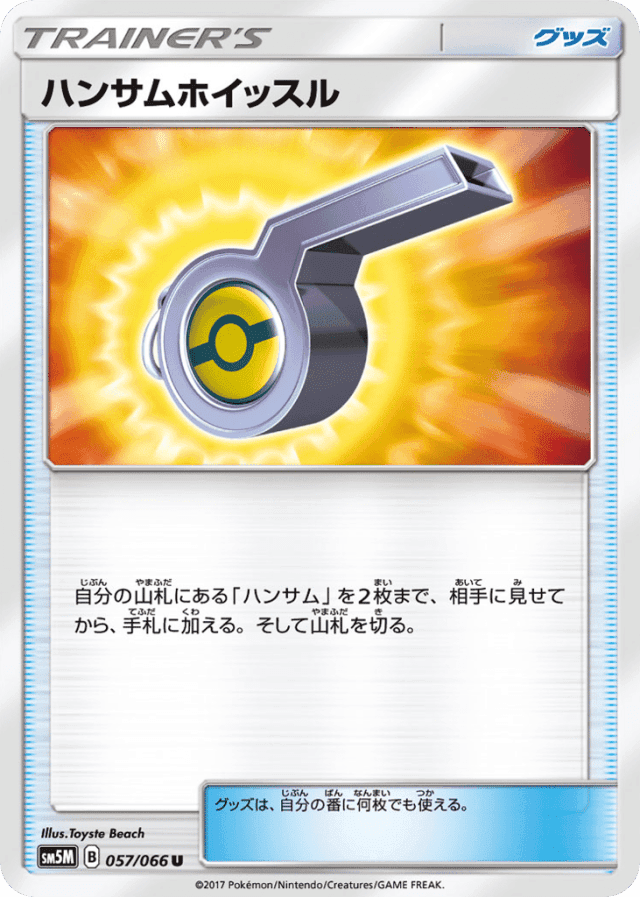 自分の山札にある「ハンサム」を2枚まで、相手に見せてから、手札に加える。そして山札を切る。 グッズは、自分の番に何枚でも使える。