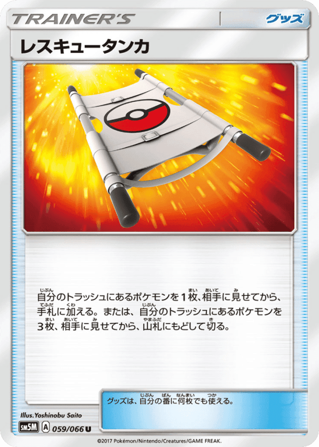 自分のトラッシュにあるポケモンを1枚、相手に見せてから、手札に加える。または、自分のトラッシュにあるポケモンを3枚、相手に見せてから、山札にもどして切る。 グッズは、自分の番に何枚でも使える。