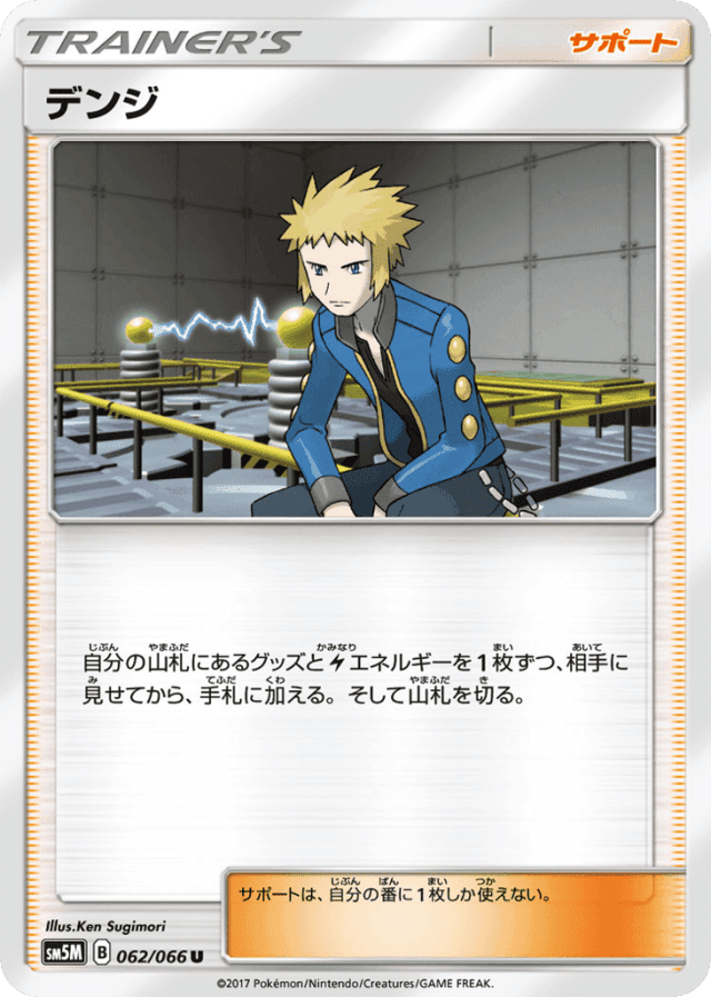 自分の山札にあるグッズとElectricエネルギーを1枚ずつ、相手に見せてから、手札に加える。そして山札を切る。 サポートは、自分の番に1枚しか使えない。