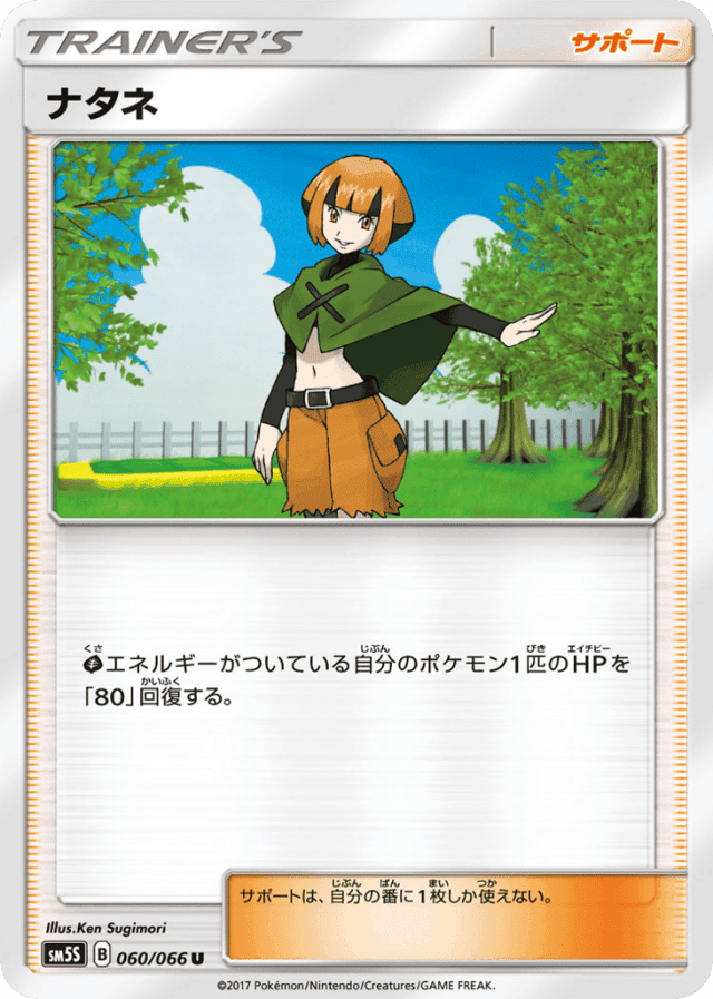 - Grassエネルギーがついている自分のポケモン1匹のHPを「80」回復する。 — サポートは、自分の番に1枚しか使えない。