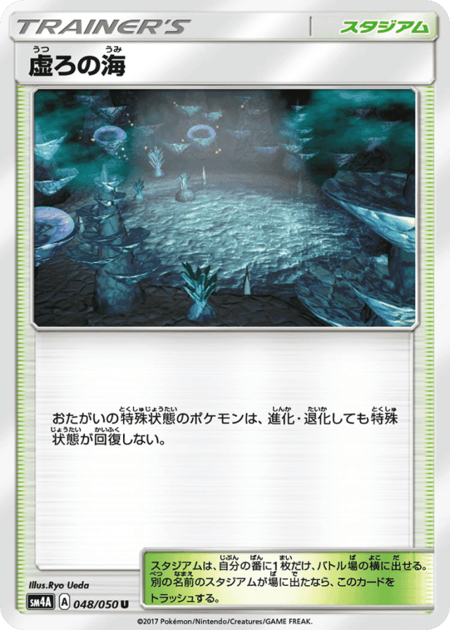 - おたがいの特殊状態のポケモンは、進化・退化しても特殊状態が回復しない。 — スタジアムは、自分の番に1枚だけ、バトル場の横に出せる。別の名前のスタジアムが場に出たなら、このカードをトラッシュする。
