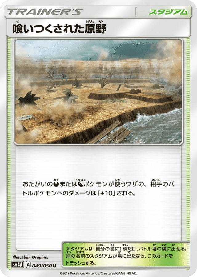 - おたがいのDarknessポケモンが使うワザの、相手のバトルポケモンへのダメージは「+10」される。 — スタジアムは、自分の番に1枚だけ、バトル場の横に出せる。別の名前のスタジアムが場に出たなら、このカードをトラッシュする。