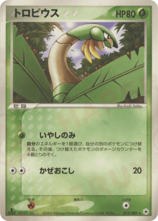 Move 1 Energy card attached to Tropius to another of your Pokémon and remove 4 damage counters from that Pokémon (all if there are less than 4).