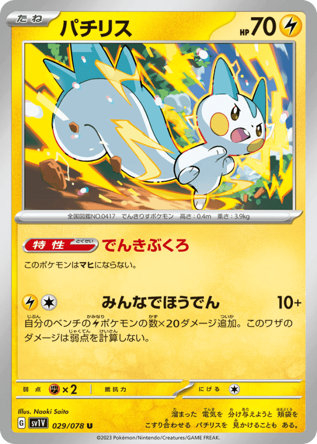 Everyone Discharge Now10+Cost: 2自分のベンチのElectricポケモンの数×20ダメージ追加。このワザのダメージは弱点を計算しない。