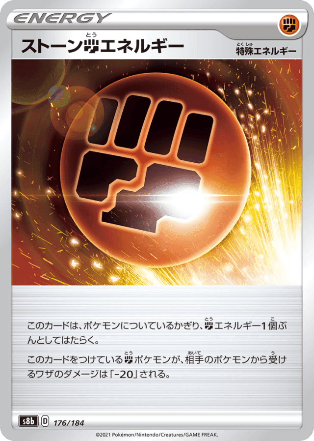 - このカードは、ポケモンについているかぎり、Fightingエネルギー1個ぶんとしてはたらく。 — このカードをつけているFightingポケモンが、相手のポケモンから受けるワザのダメージは「-20」される。