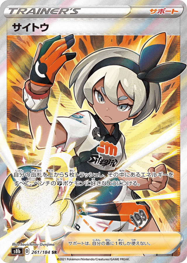 自分の山札を上から5枚トラッシュし、その中にあるエネルギーをすべて、ベンチのFightingポケモンに好きなようにつける。 サポートは、自分の番に1枚しか使えない。