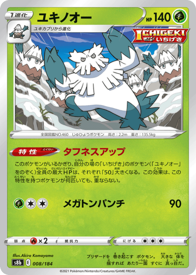 このポケモンがいるかぎり、自分の場の「いちげき」のポケモン(「ユキノオー」をのぞく)全員の最大HPは、それぞれ「50」大きくなる。この効果は、この特性を持つポケモンが何匹いても、重ならない。