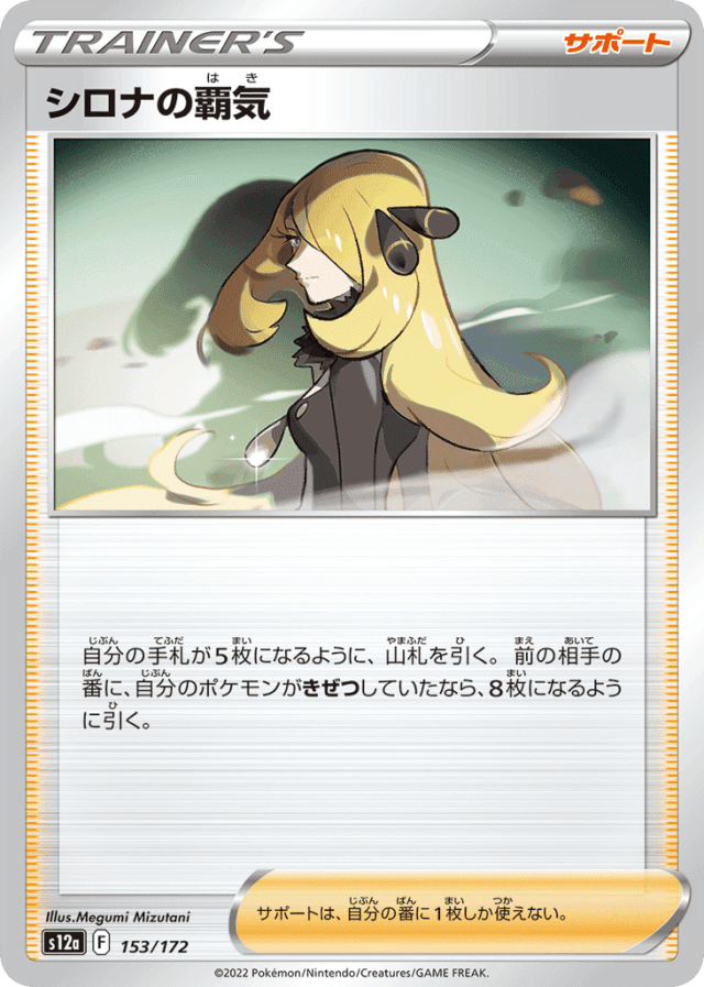 自分の手札が5枚になるように、山札を引く。前の相手の番に、自分のポケモンがきぜつしていたなら、8枚になるように引く。 サポートは、自分の番に1枚しか使えない。