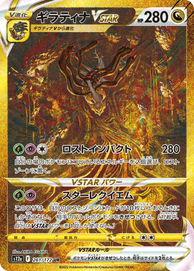 Star RequiemCost: 2このワザは、自分のロストゾーンにカードが10枚以上あるときにしか使えない。相手のバトルポケモンをきぜつさせる。[対戦中、自分はVSTARパワーを1回しか使えない。]