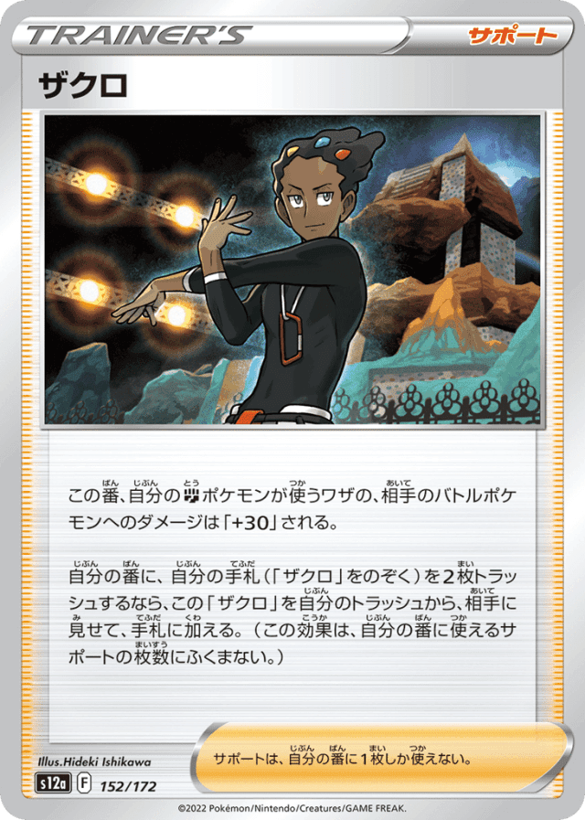 この番、自分のFightingポケモンが使うワザの、相手のバトルポケモンへのダメージは「+30」される。 自分の番に、自分の手札(「ザクロ」をのぞく)を2枚トラッシュするなら、この「ザクロ」を自分のトラッシュから、相手に見せて、手札に加える。(この効果は、自分の番に使えるサポートの枚数にふくまない。) サポートは、自分の番に1枚しか使えない。