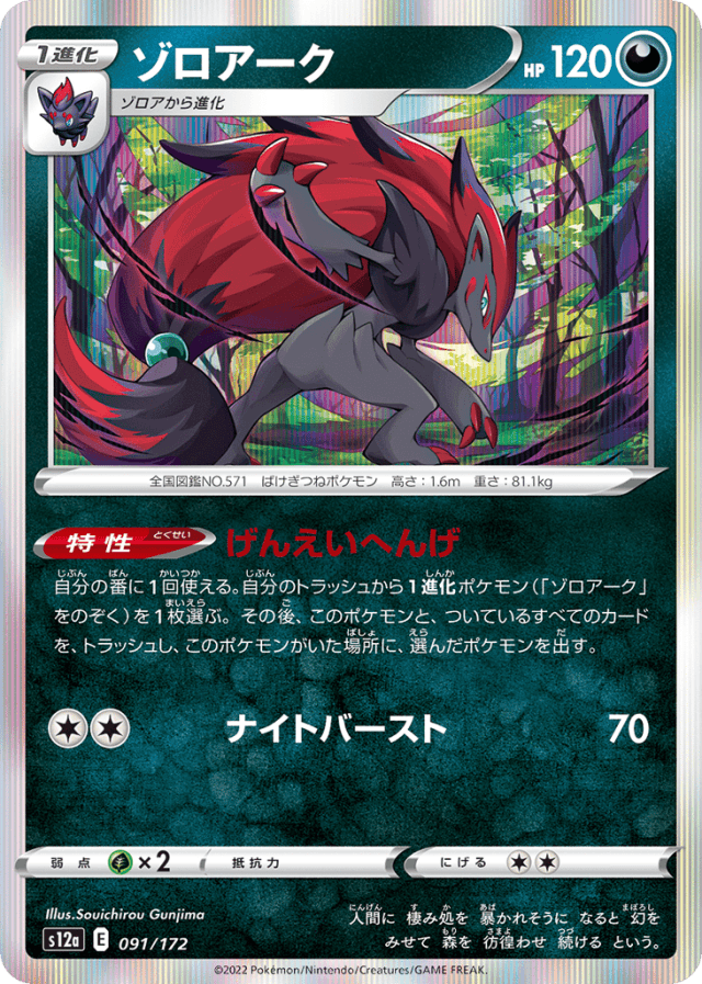 自分の番に1回使える。自分のトラッシュから1進化ポケモン(「ゾロアーク」をのぞく)を1枚選ぶ。その後、このポケモンと、ついているすべてのカードを、トラッシュし、このポケモンがいた場所に、選んだポケモンを出す。