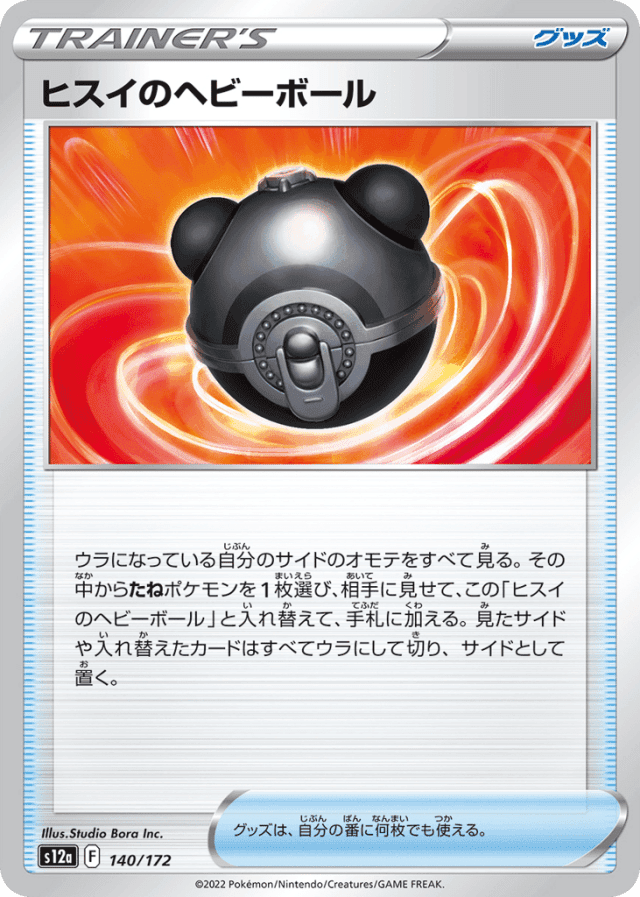 ウラになっている自分のサイドのオモテをすべて見る。その中からたねポケモンを1枚選び、相手に見せて、この「ヒスイのヘビーボール」と入れ替えて、手札に加える。見たサイドや入れ替えたカードはすべてウラにして切り、サイドとして置く。 グッズは、自分の番に何枚でも使える。