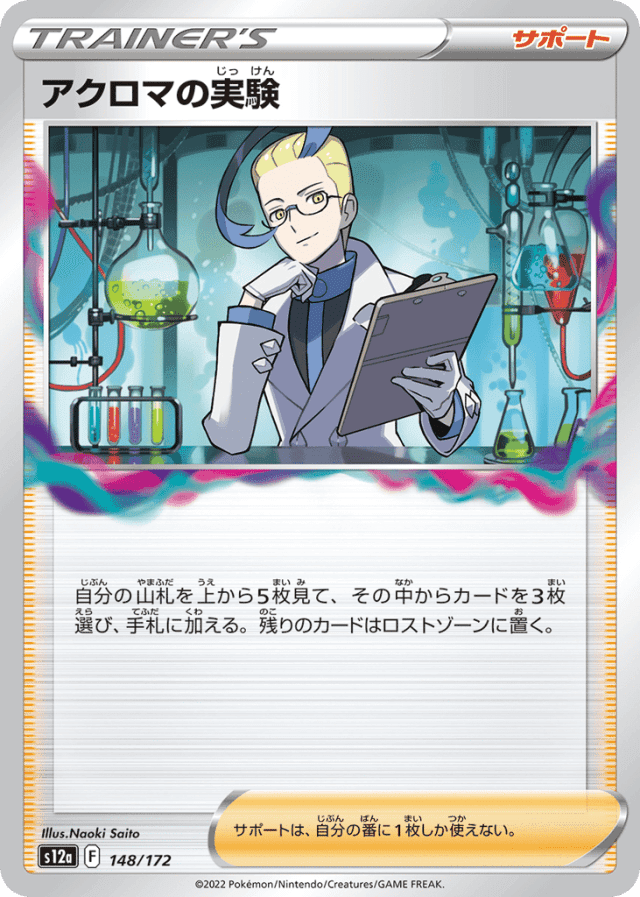 自分の山札を上から5枚見て、その中からカードを3枚選び、手札に加える。残りのカードはロストゾーンに置く。 サポートは、自分の番に1枚しか使えない。
